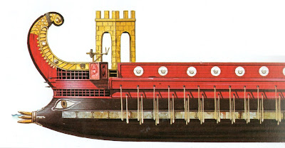 Interestingly, Warfare in the Classical World has a reconstruction clearly based on the classical original from this relief. The interpretation of the ram here is exactly as Grand Manner have done it. The placement of the castle is interesting as the illustrator has interpreted it as being with the sides at 45 degrees to the side of the ship's bulwark, rather than parallel. Is this what the original shows, or is it an attempt to show perspective (which would be very unusual in ancient painting)? Another decision to make!